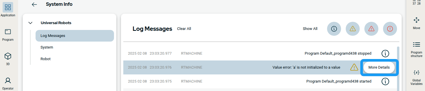 For some log messages, it is possible to view additional information by pressing the More Details button that appears when the message is selected in the list.