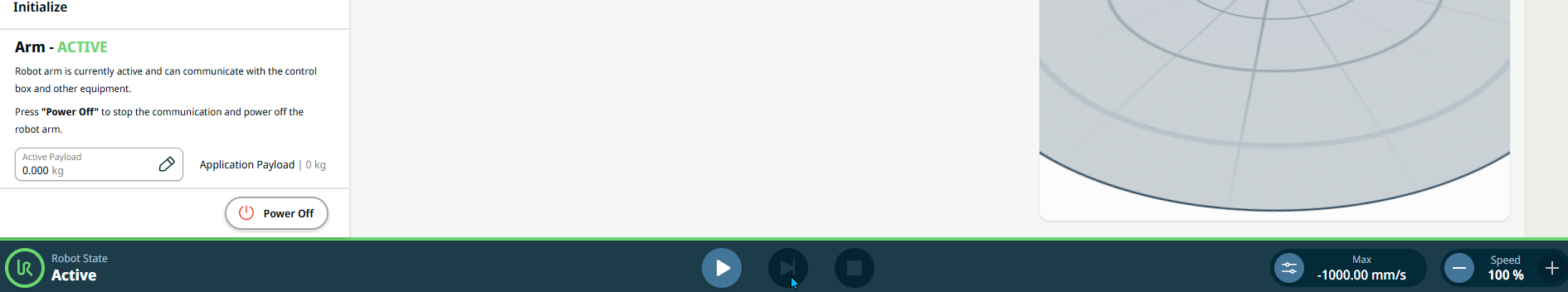 The Footer, also called robot control bar, contains buttons to control robot state, program play and stop, and control sliders for manual high speed and robot speed.