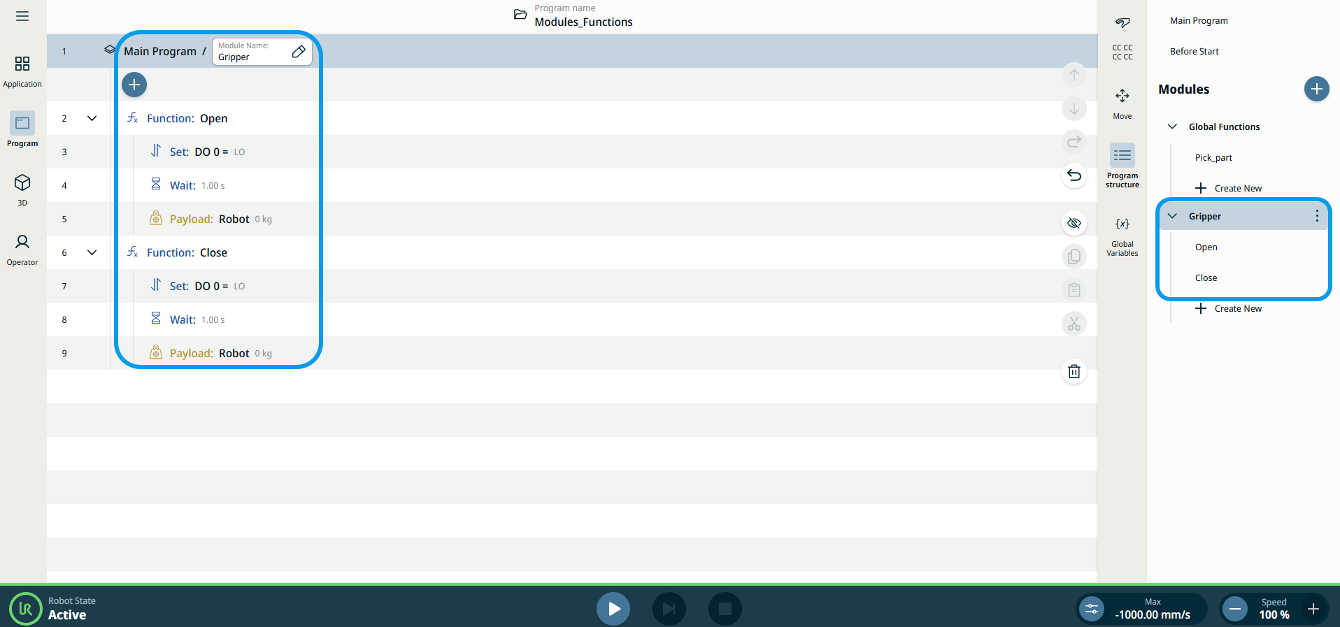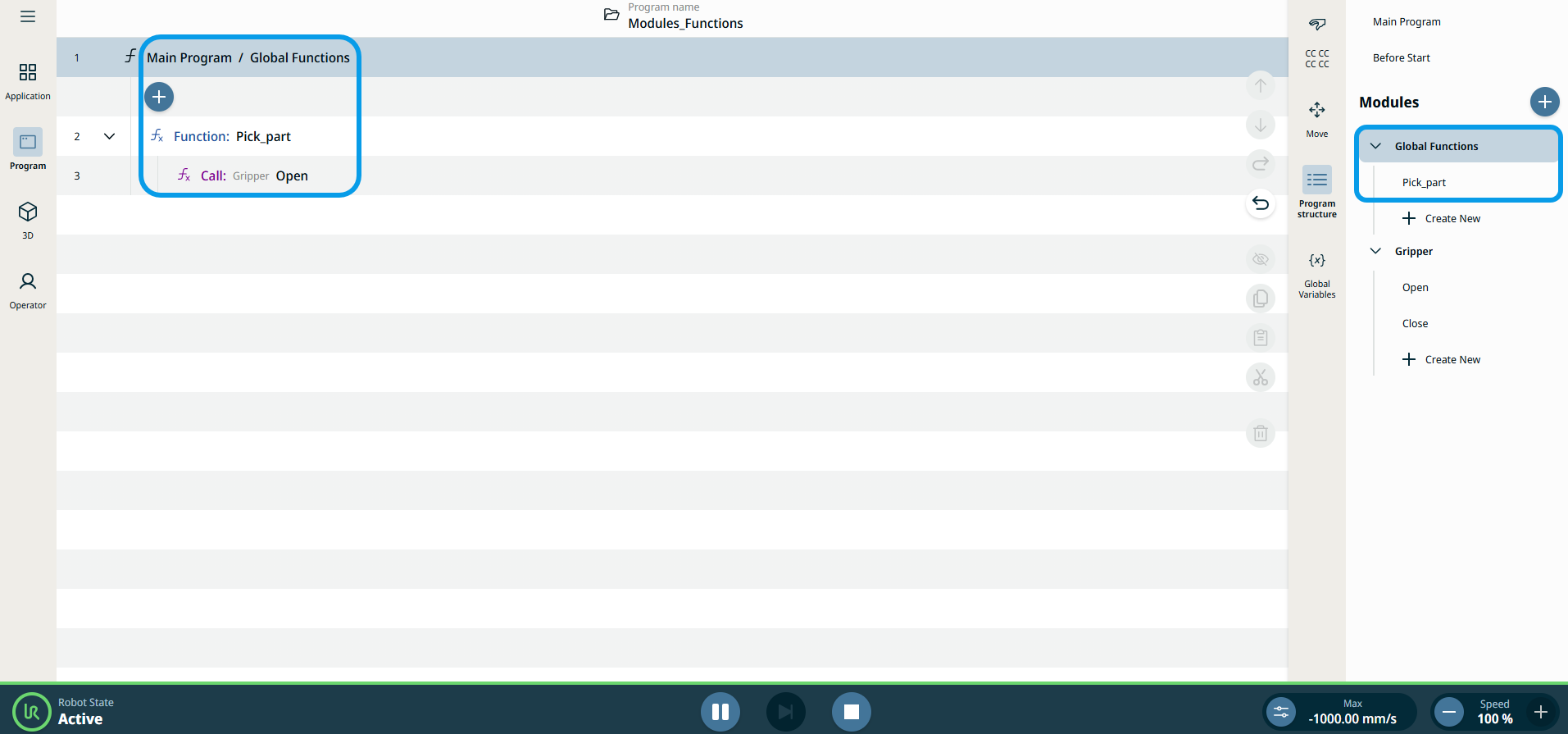 In the multisk screen, tap the Modules add icon and a module tree is inserted under Global GFunction. Tap the Module kebab icon, and choose Rename. Type the Module name as Gripper, and Confirm. This gathers together all the functionality of different function for a gripper that you want to create. Tap + Create New to create a function underneath Gripper module, rename that as Open, and Confirm. Repeat the step above to create a second function for the Gripper and name it as Close. In the main screen, you can see in the main program the gripper module with and open and close function. That way you can implement the functionaltiy in your open function. I’s asmal ggatnhering. The benefit is that you are only viewing the functionality of that one function. It’s not blurred by the entire program and having to figure out where it’s hapoopwning. A function can call another function.