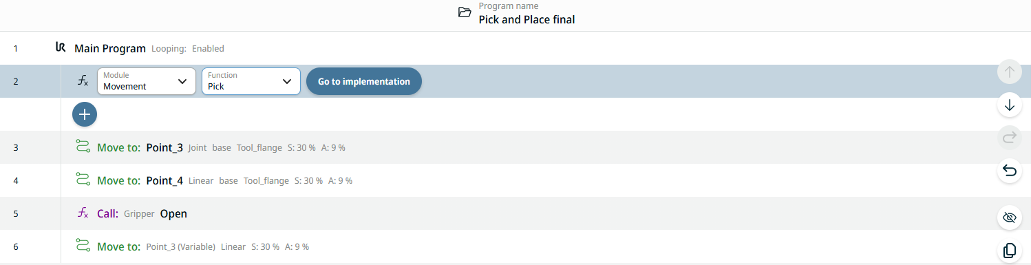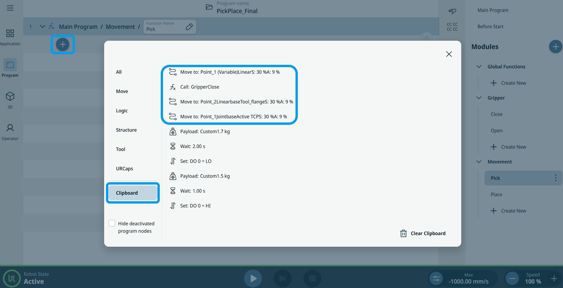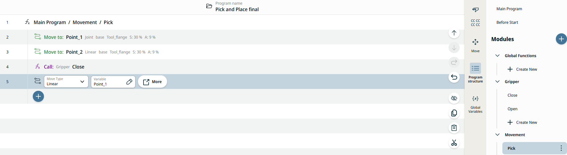 Tap again the Main Program to insert the Movement Pick Function into the program tree.