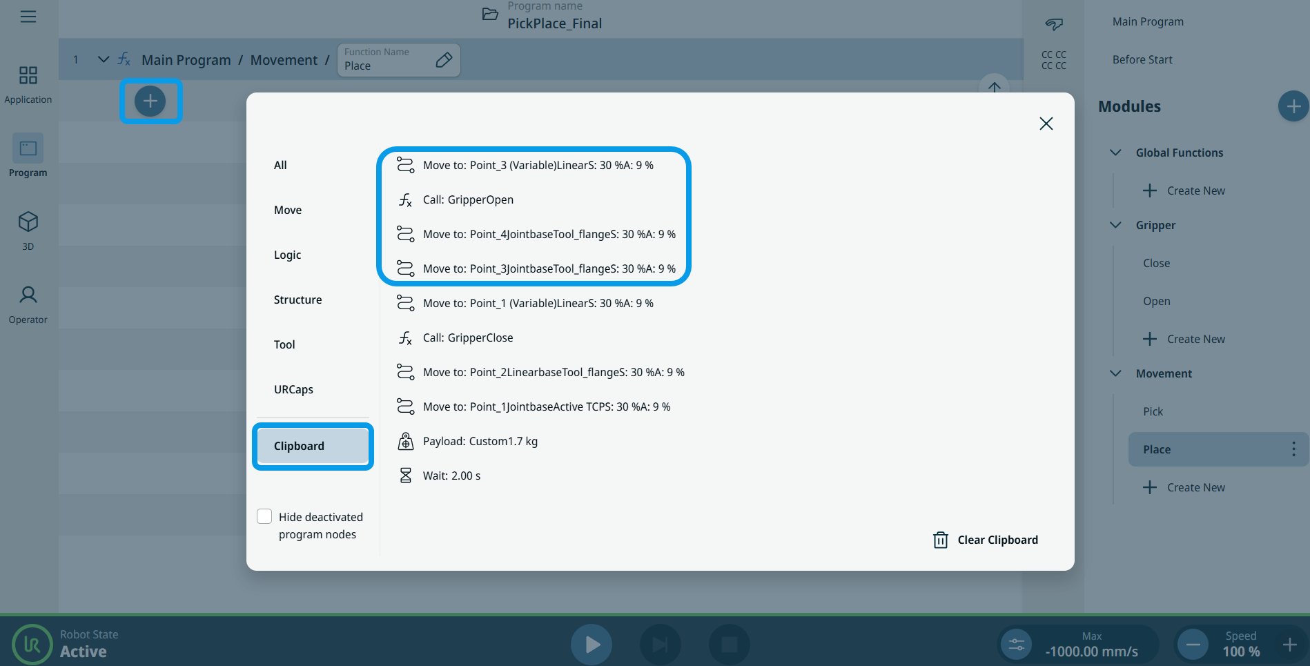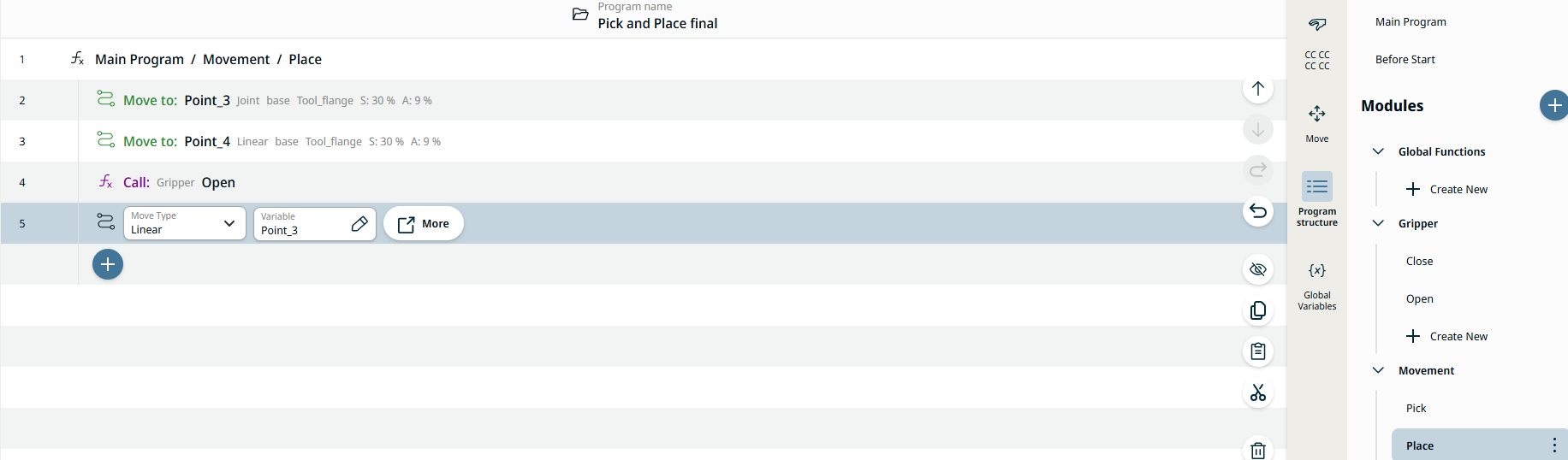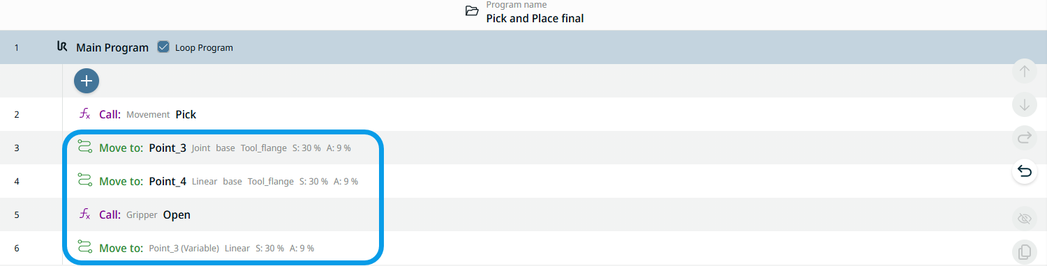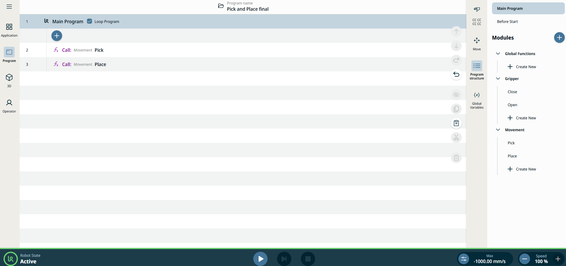 In structuring your program by functions and modules, it is possible to call functions within functions to make everything even more reusable. Creating a full program mainly comprised of functions will make it easier for you to manage long programs. Furthermore, you make the program more maintainable and avoid repetition in your programing. As you can see on the 3D viewer and Operator screen, the robot movements are still the same as before.