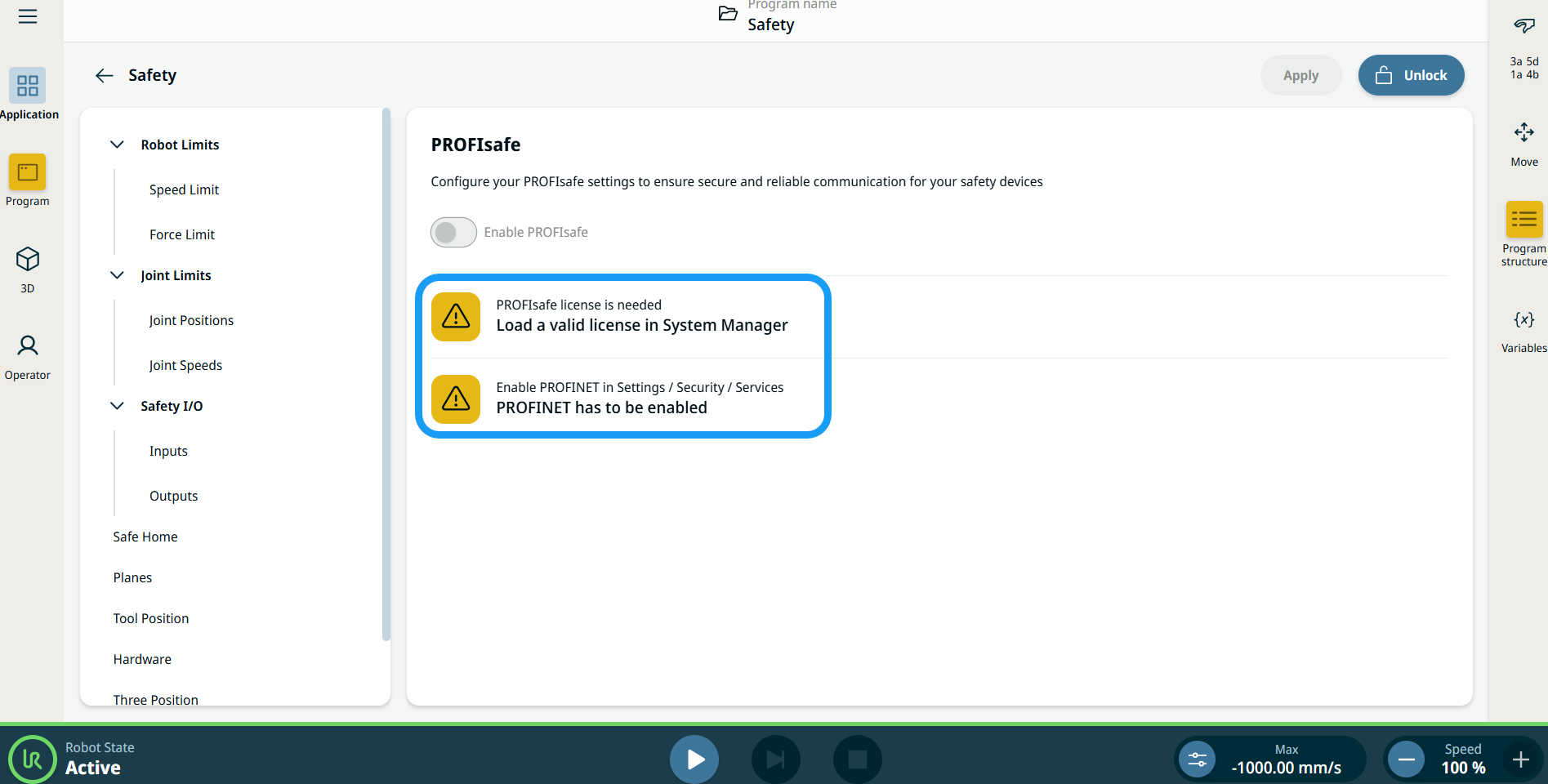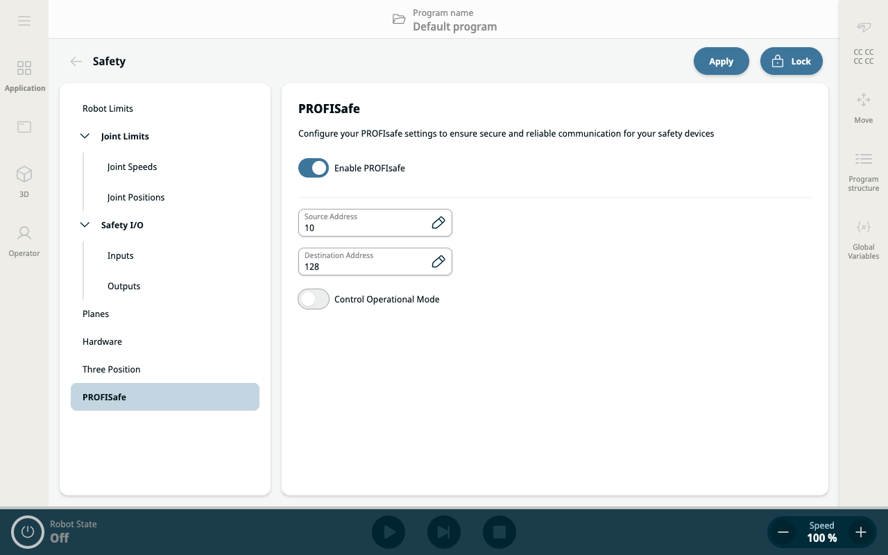 The PROFIsafe network protocol (implemented as version 2.6.1) allows the robot to communicate with a safety PLC according to ISO 13849, Cat 3 PLd requirements. The robot transmits safety state information to a safety PLC and receives commands to reduce safety limits or trigger a safety-related function such as an emergency stop. The PROFIsafe interface provides a safe, network-based alternative to connecting wires to the safety IO pins of the robot control box. PROFIsafe is only available on robots that have an enabling license, which you can obtain by contacting your local sales representative. After you obtain the license, download it from myUR. For information about robot registration and license activation, see Robot Registration and License File.