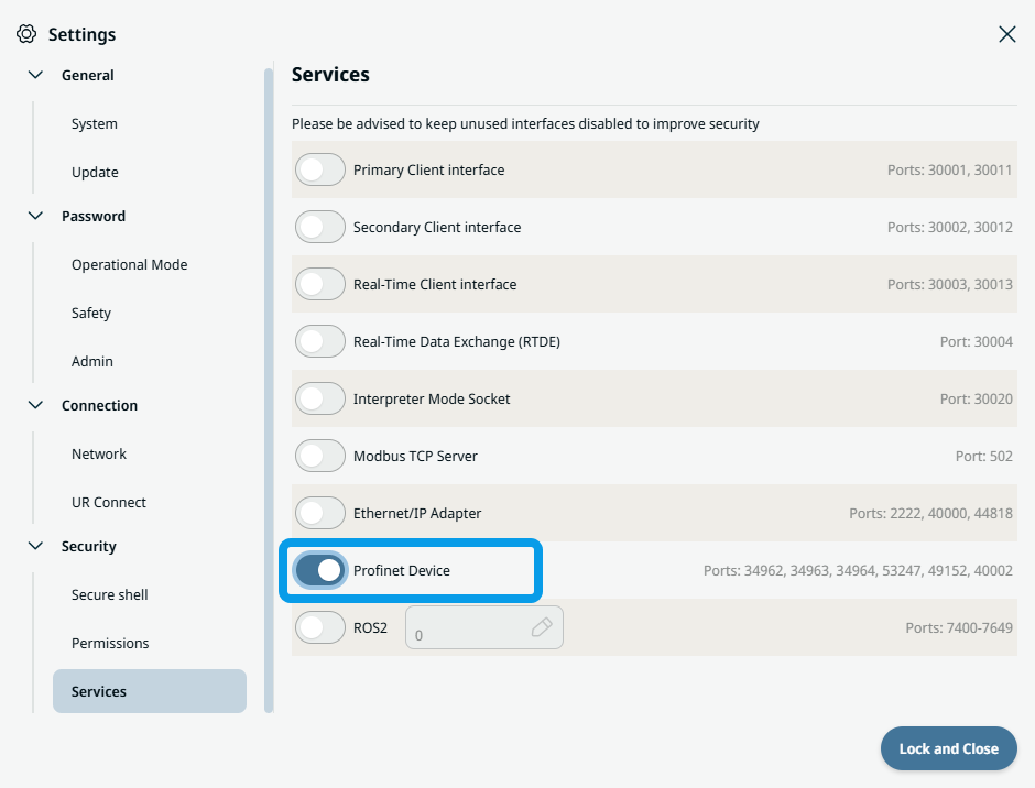 In order to configure and use PROFIsafe, PROFINET Device must be enabled in the security services settings menu.