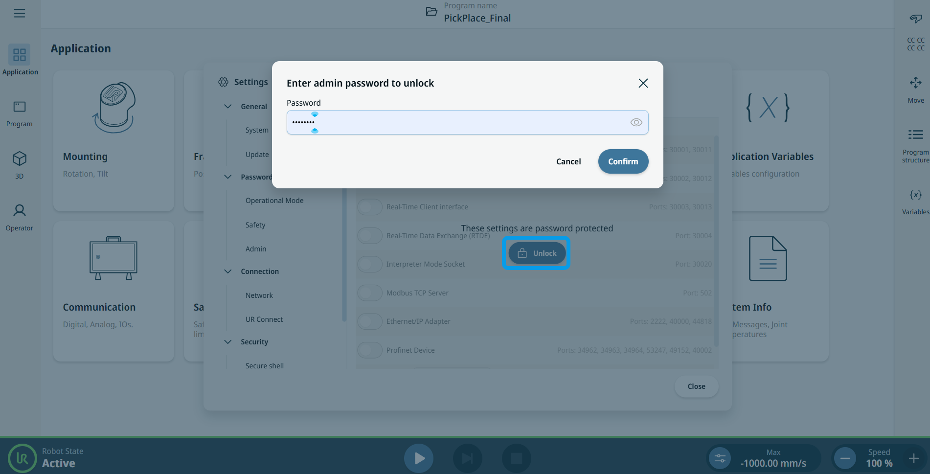 Services lists the standard services running on the robot. You can enable or disable each service. All services are disabled as a security feature and are password protected. When you start or configure your robot, you have to unlock and enable relevant services. An enabled service remains available even if the ports associated with that service are blocked. So, simply blocking a port is not enough to prevent access to the listed services if they are enabled.
