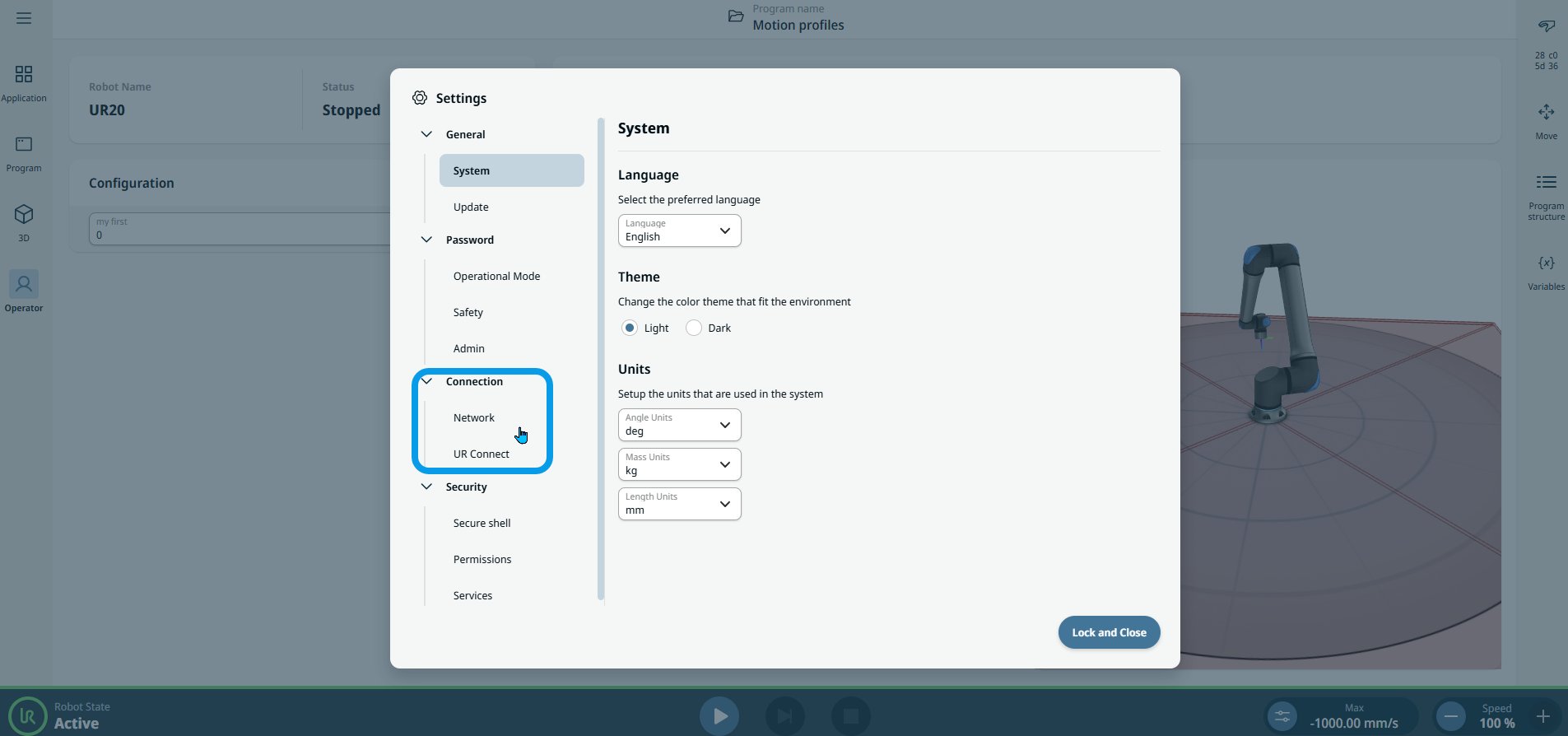 The Connection setting of PolyScope X software enables you to access robot data anytime, anywhere. You can access the Connection setting via the hamburger menu.