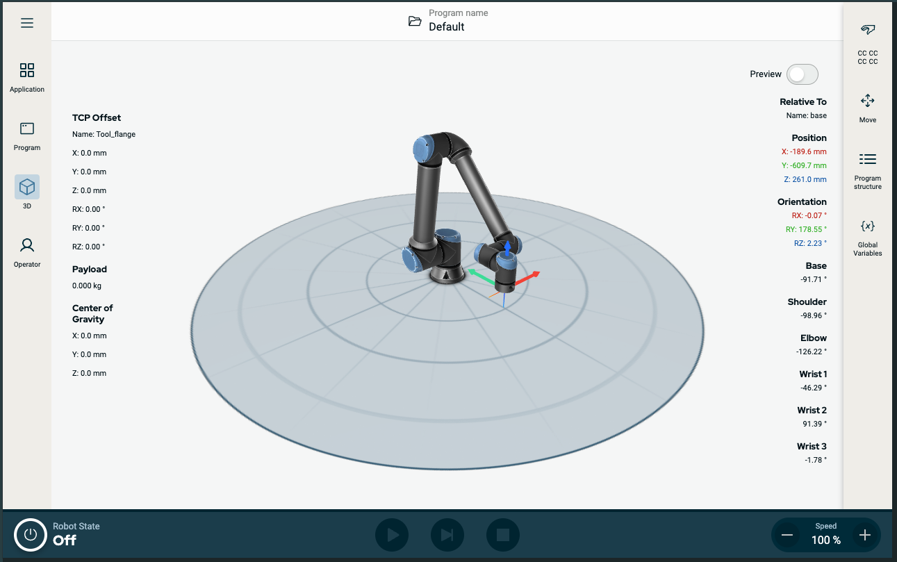 PolyScope X is the Graphical User Interface (GUI) installed on the Teach Pendant that operates the robot arm via a touch screen. The PolyScope X interface allows you to create, load and execute programs. |