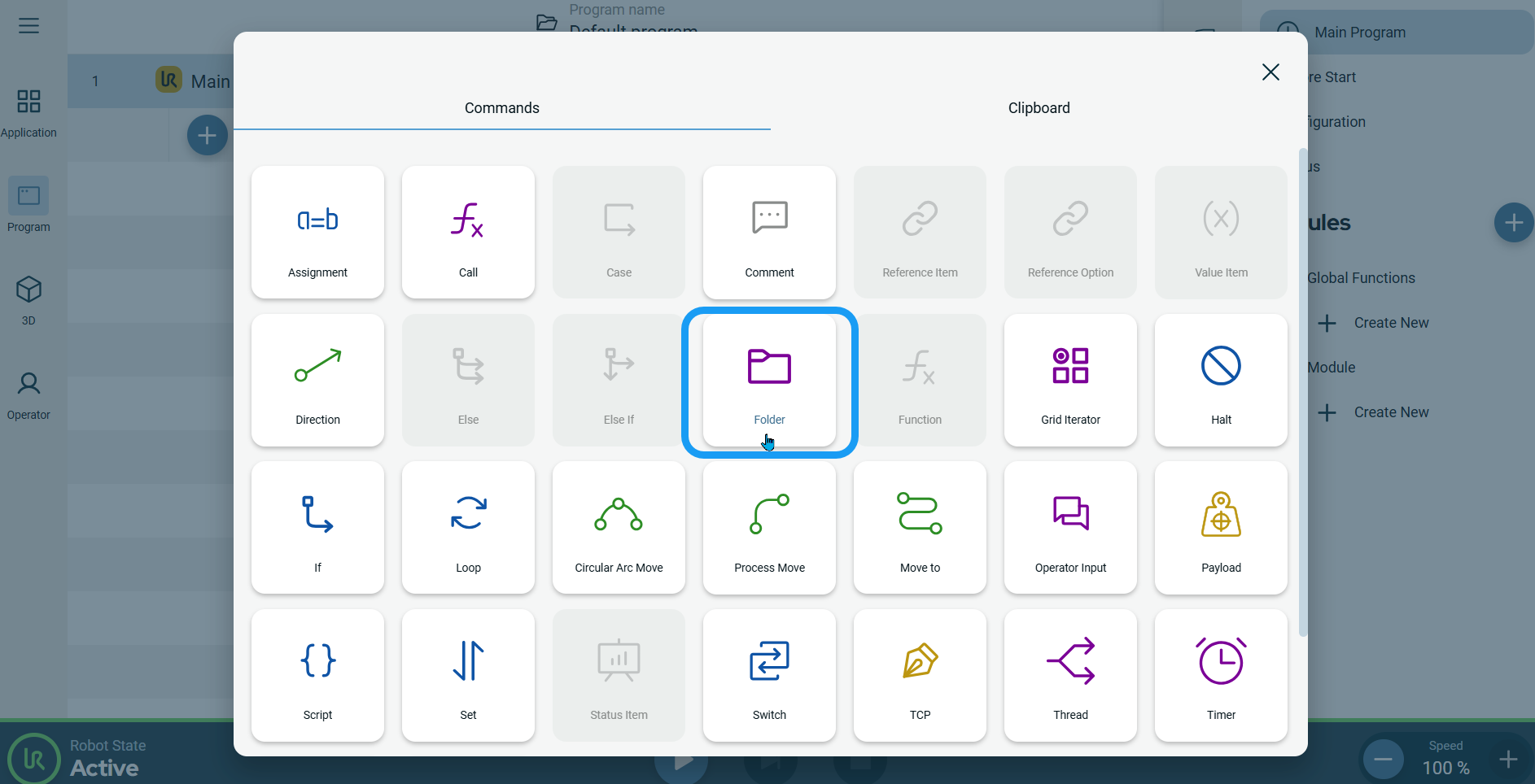 The Folder command allows you to use folders to create an easy-to-read overview of the main parts of your robot program.