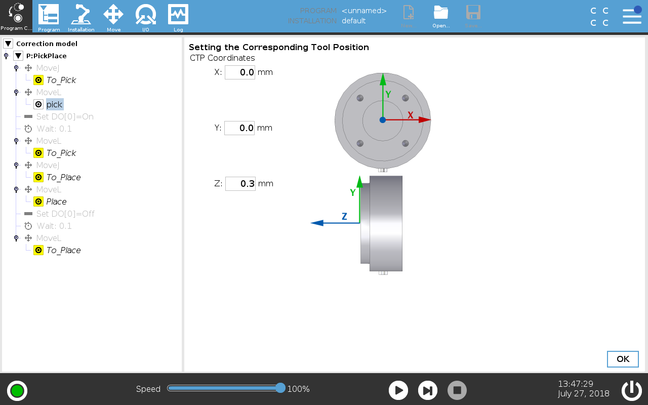 When the Move Tab is activated, teach the robot a new position and tap OK.