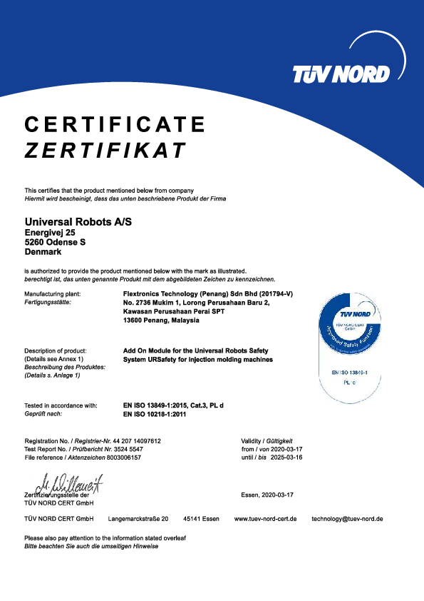The Universal Robots Injection Molding Machine Interface (IMMI) module (stop function and I/O), is safety approved by TÜV NORD, a notified body under the machine directive 2006/42/EC in the EU.