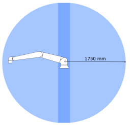 The workspace is the range of the fully extended robot arm, horizontally and vertically. The operating space is the location where the robot is expected to function. Disregard for the robot workspace and operating space can result in the damage to property.