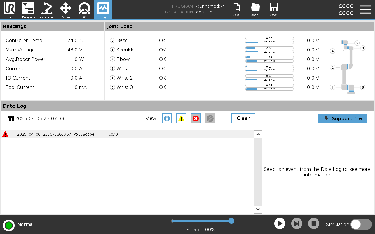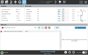 The Log tab displays information about the robot arm and Control Box.