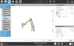 Configuration of the tool direction is based on features. We recommend you create desired feature(s) before editing the safety configuration, as once the Safety Tab has been unlocked, the robot arm powers off making it impossible to define new features.