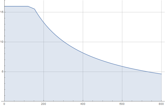 The rated robot arm payload depends on the center of gravity (CoG) offset of the payload, as shown below. The CoG offset is defined as the distance from the center of the tool flange to the center of gravity of the attached payload.