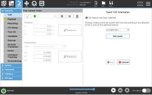 Tap Set point and use Move tool arrows to a position where the tool’s orientation and the corresponding TCP coincide with the selected features’s coordinate system.