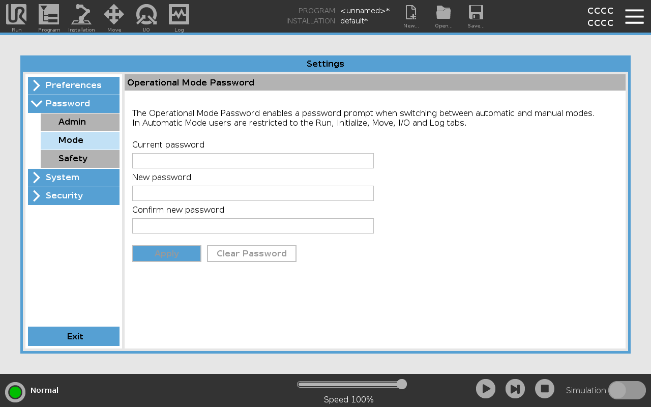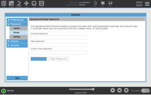 You can create and manage different types of password in PolyScope. An initial password must be set to access the full safety settings. The following password types are described below: