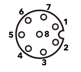 The tool connector illustrated below provides power and control signals for the grippers and sensors used on a specific robot tool. The tool connector has eight holes and is located next to the tool flange on Wrist 3. The eight wires inside the connector have different functions, as listed below: