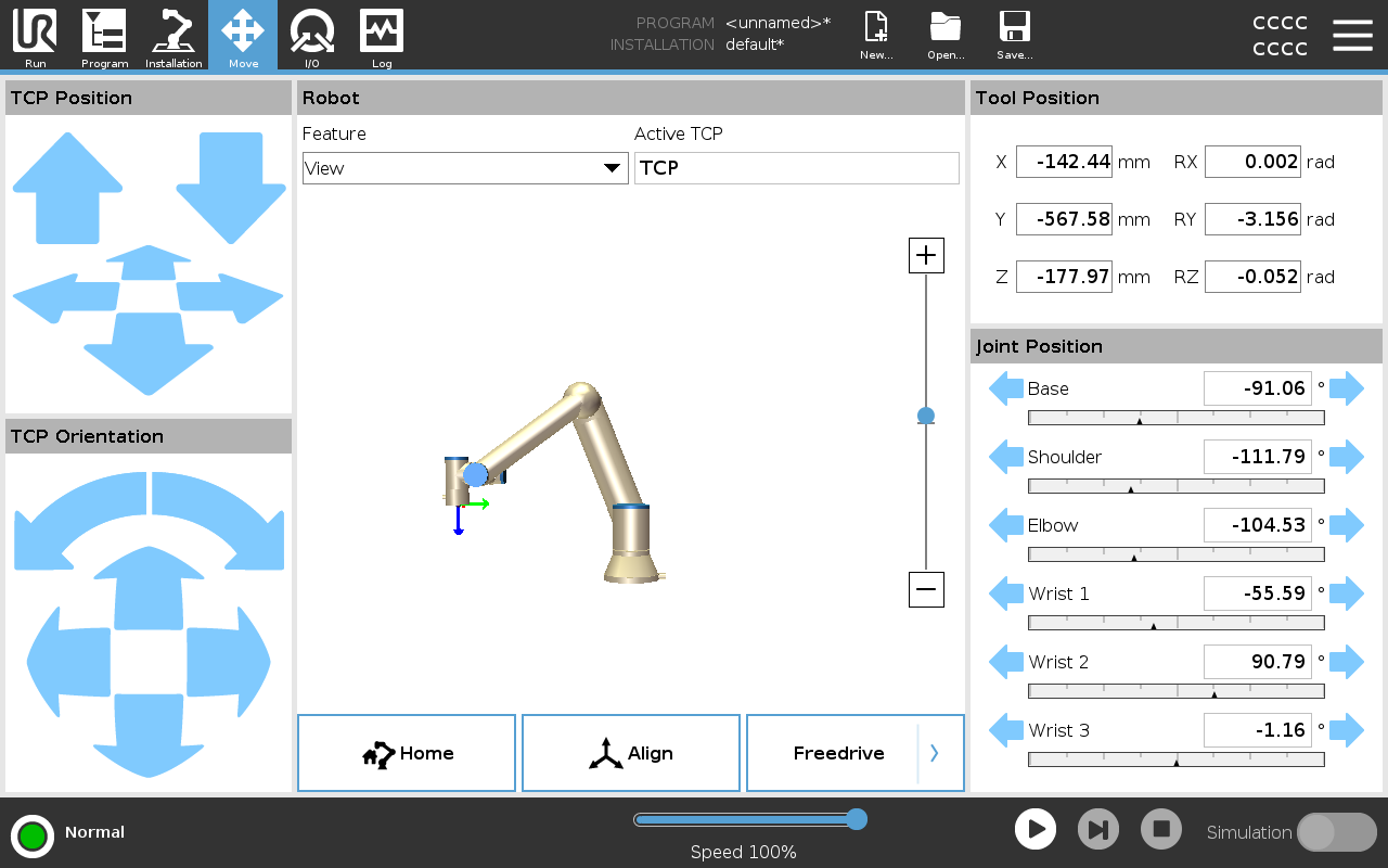 The on-screen Freedrive button allows the Robot Arm to be pulled into desired positions/poses.
