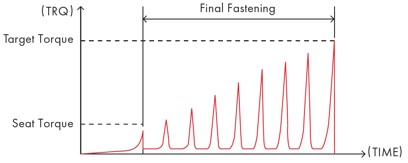 A smaller group of tools use pulse-driven fastening techniques, in which the torque reaction is smaller than in continuous fastening (some manufacturers claim reductions of up to 70-80 % with pulse-driven tools) by applying the torque in a sequence of increasing torque pulses as shown below: