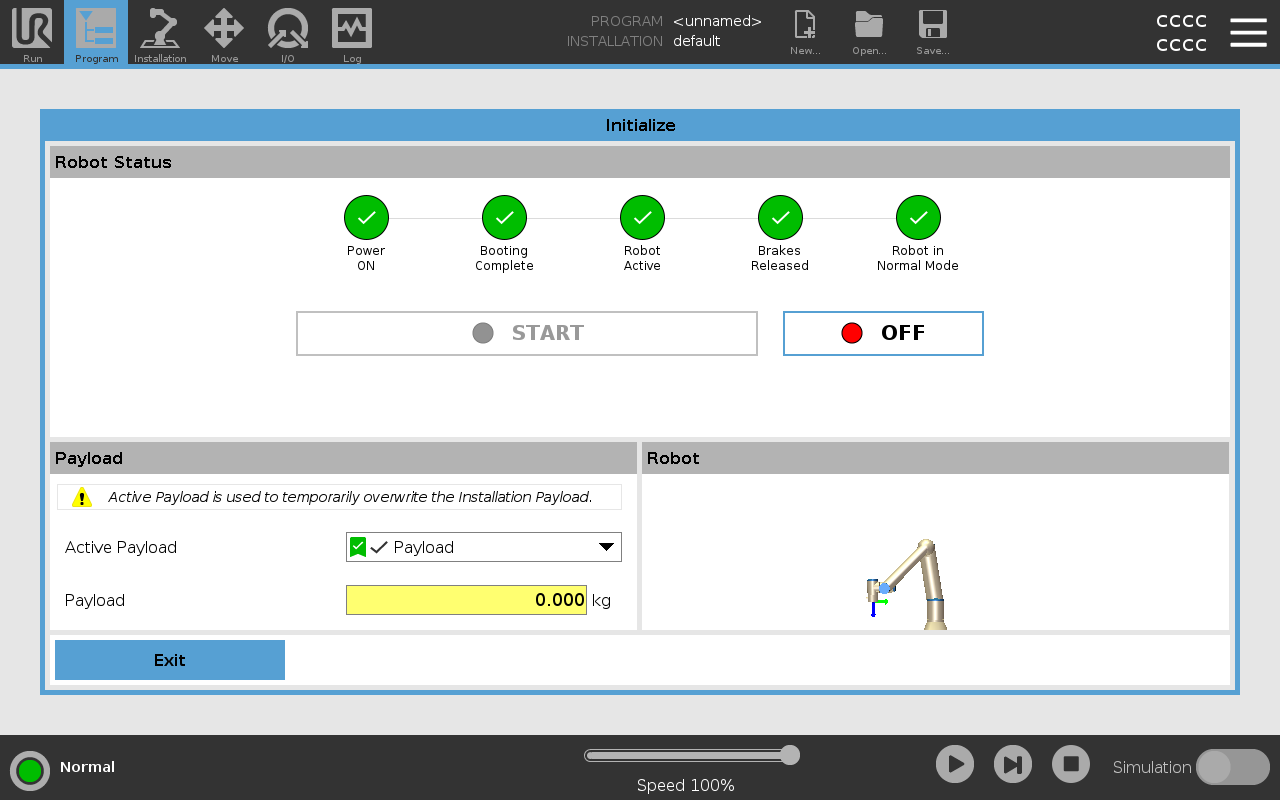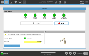 Starting the robot arm disengages the braking system, allowing you to start moving the robot arm and to start using PolyScope. You can follow the progression as the circles in the Initialize box change color. The Initialize button in the Footer also changes color depending on the status of the robot arm.