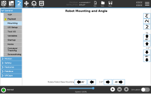 On the Robot Mounting and Angle screen, use the buttons on the right to set the angle of the robot arm mounting. The first three buttons set the angle as follows: