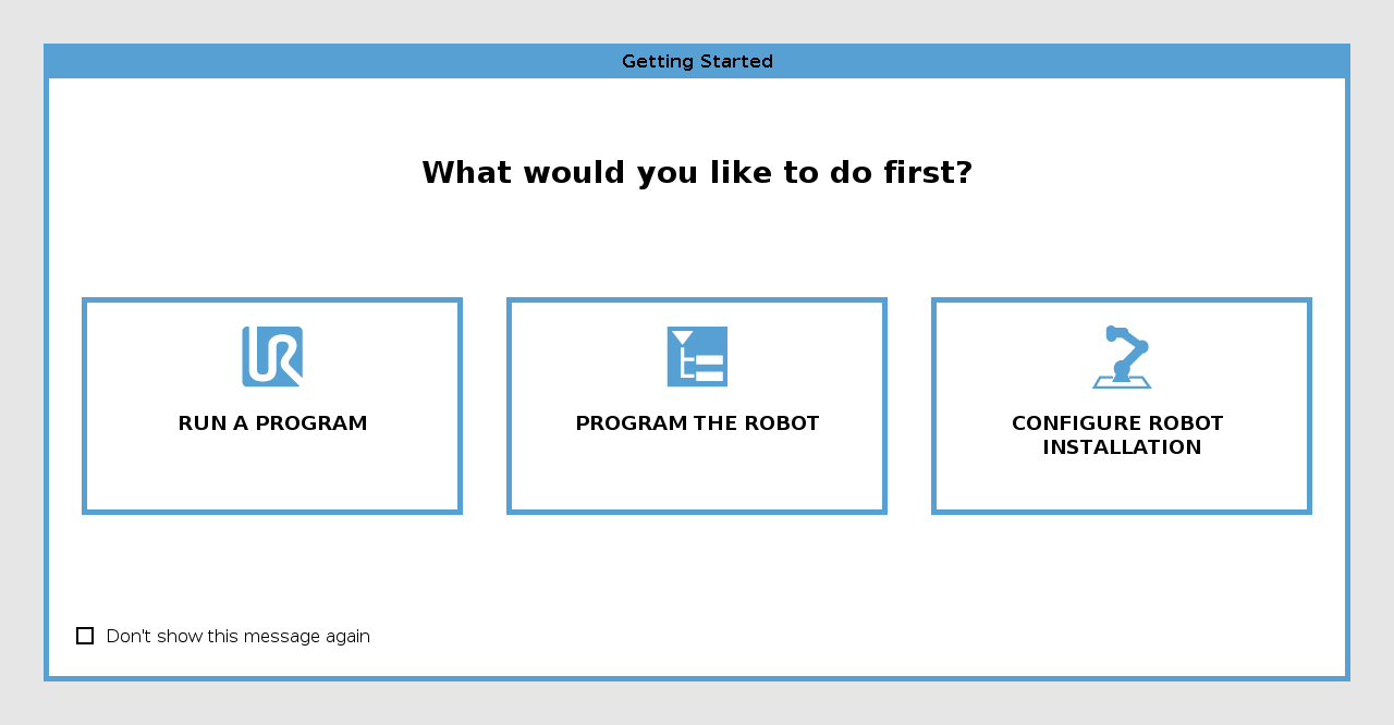 During the first start up, you may need to verify how the robot arm is mounted. If the robot arm is mounted on a flat table or floor, no change is needed. If the mounting of the robot arm is not verified, the Getting Started dialog box appears.