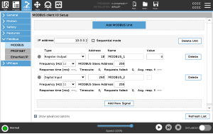 Here, the MODBUS client (master) signals can be set up. Connections to MODBUS servers (or slaves) on specified IP addresses can be created with input/output signals (registers or digital). Each signal has a unique name so it can be used in programs.