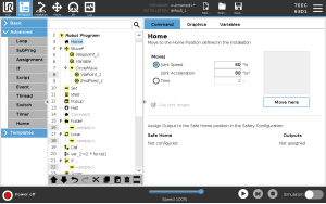 The Home node uses joint angles to move the robot to a predefined Home position. If defined as a Safe Home position,the Home node displays as Home(Safety) in the Program Tree. If the Home position is out of sync with Safety, the node is undefined.