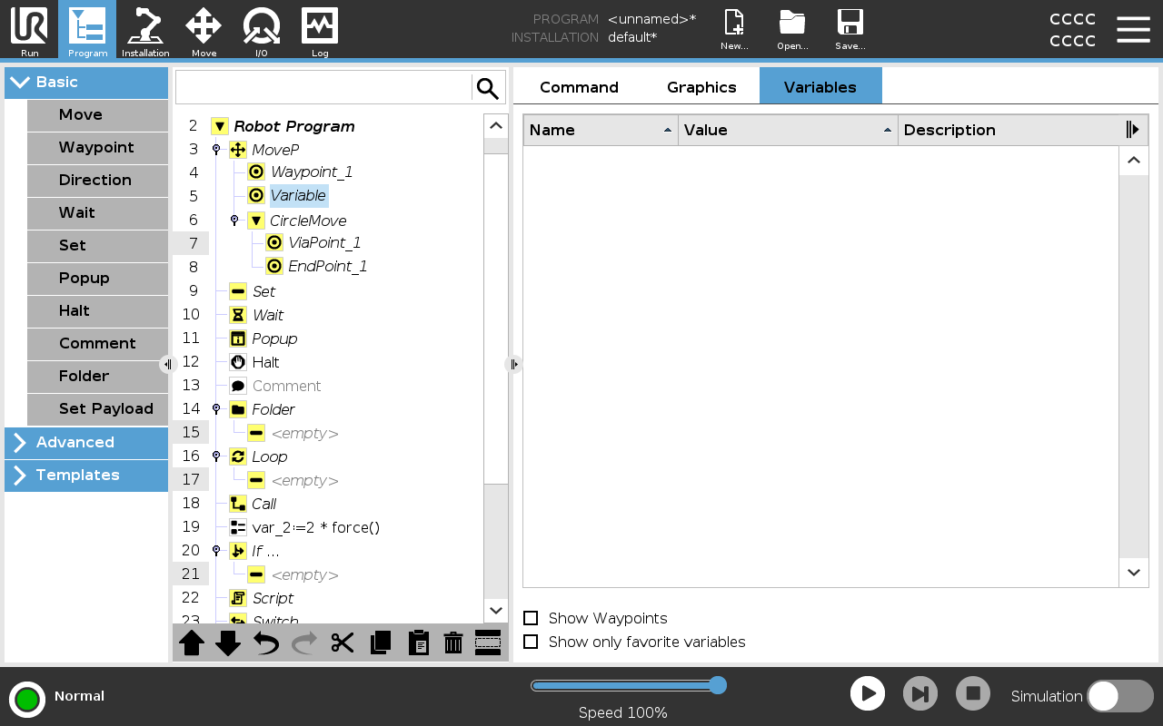 You can check the Show Waypoints box to display the waypoint variables in the running program. In the Variables pane, you can also use the following options: