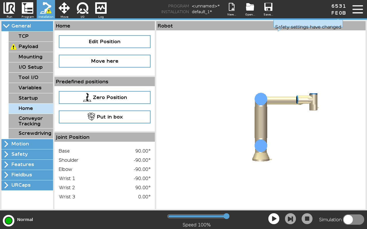 A predefined position has been added to the user interface in PolyScope 5. This replaces the previous put in box program. Put in box can be used to move the robot into a compact position that is suitable for transportation. The put in box sequence consists of an initial movement to the Zero Position, followed by a movement to the put in box position. |