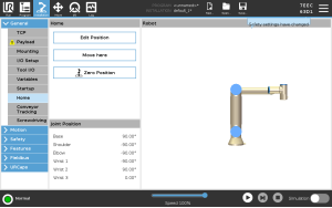 The Home node uses joint angles to move the robot to a predefined Home position. If defined as a Safe Home position,the Home node displays as Home(Safety) in the Program Tree. If the Home position is out of sync with Safety, the node is undefined.