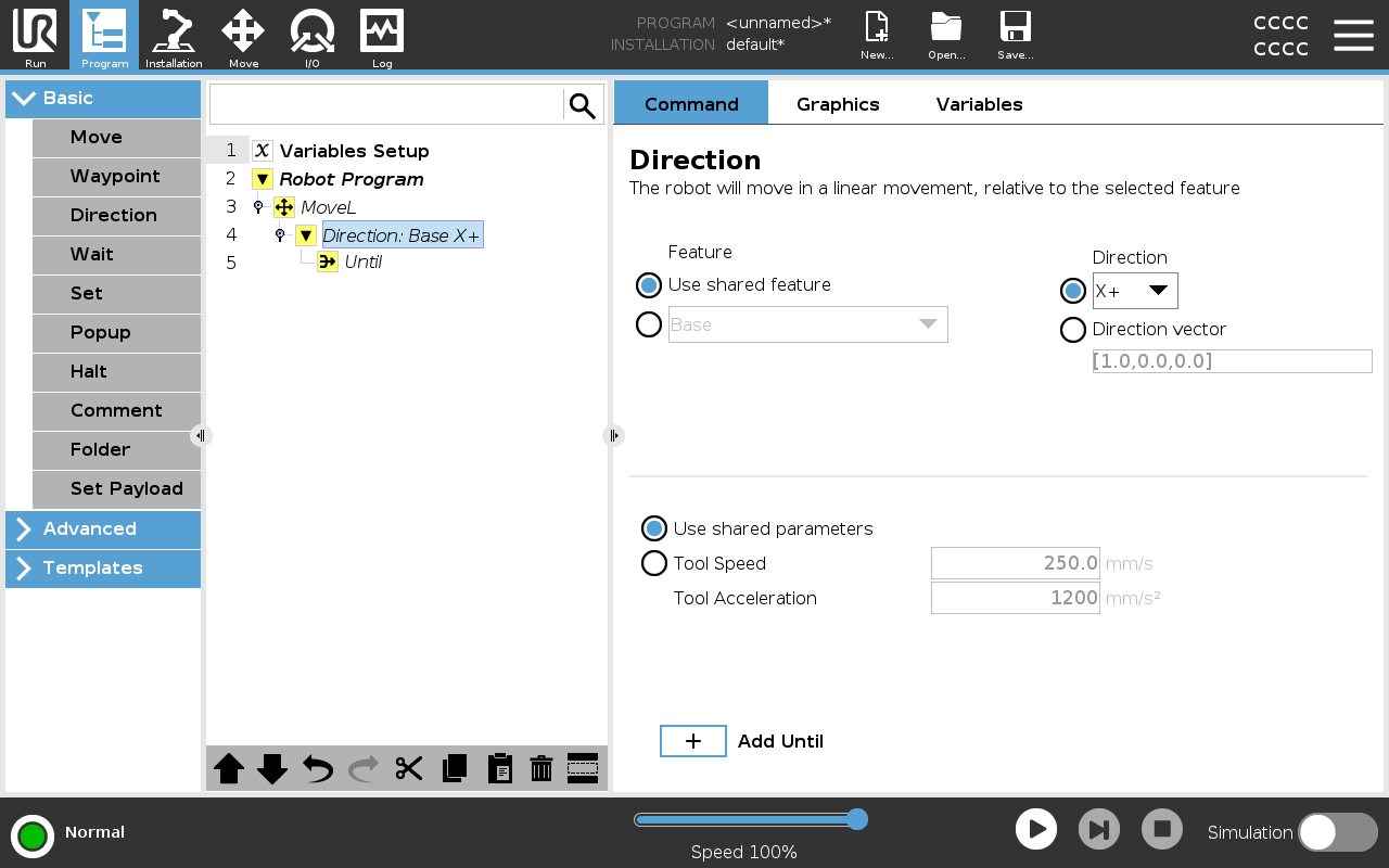 Direction vectors of [100,0,0] and [1,0,0] have the same effect on the robot; use the Speed Slider to moving along the x-axis at a desired speed. The values of the numbers in the direction vector only matter relative to each other. |