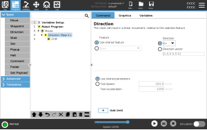 The Direction command specifies a motion relative to feature axes or TCPs. The robot moves in the path specified by the Direction program node until that movement is stopped by an Add Until condition.