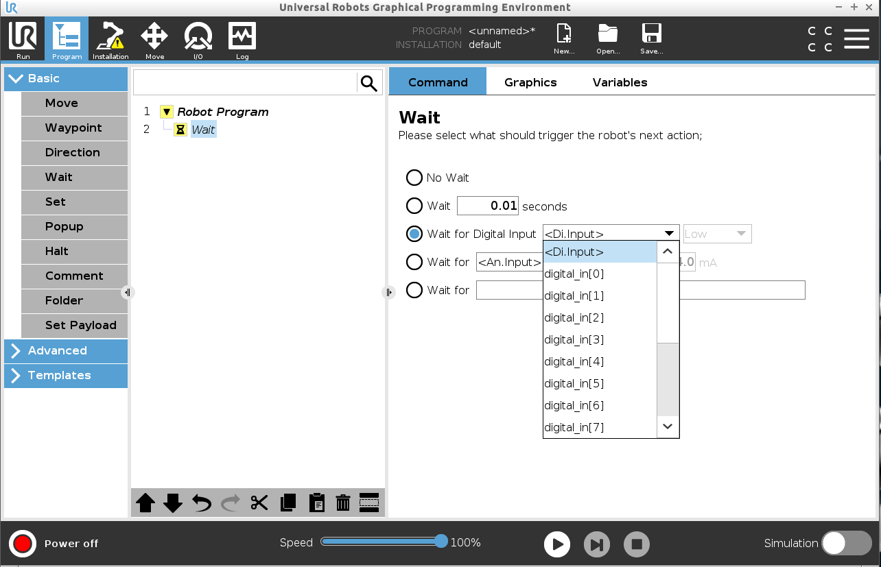 This Wait command type allows the robot to hold position until a signal is received from a digital input.