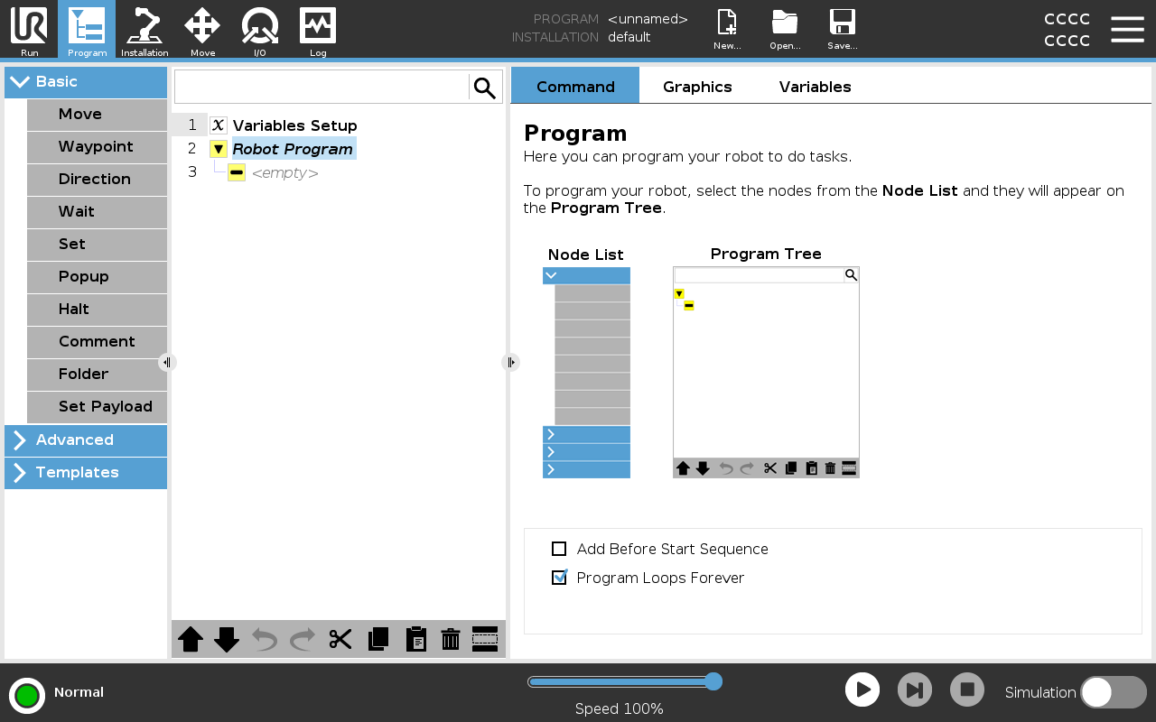 The Program tab is the where you create and edit robot programs. There are two main areas: