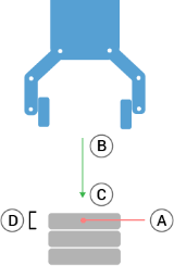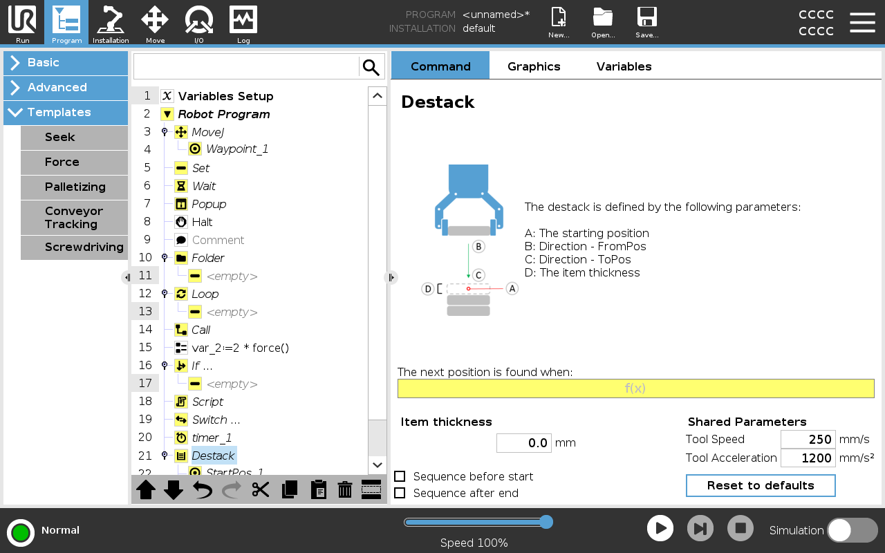 You must also define the condition for when the next stack position is reached, and a special program sequence that is performed at each stack position. Speed and accelerations need to be given for the movement involved in the stack operation.
