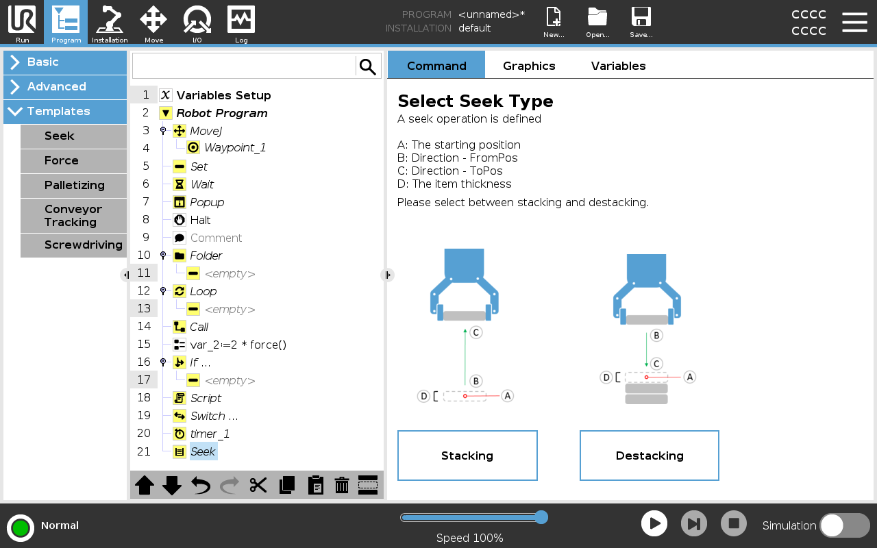 The seek function uses a sensor to determine the correct position to grab or drop an item. This function allows for working on stacks of items of varying thickness, and determining the exact positions of the items are either unknown or too hard to program. The sensor can be a push button switch, a pressure sensor or a capacitive sensor.