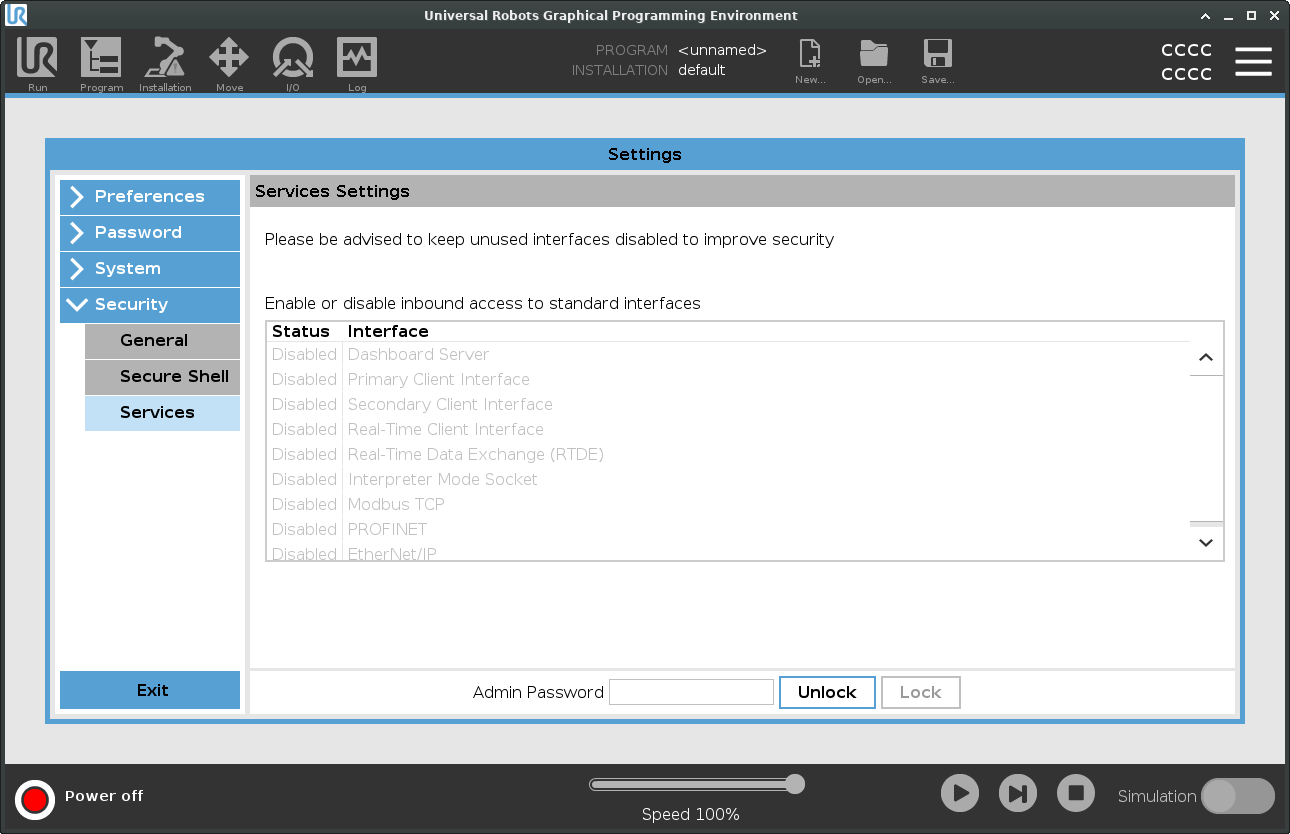 Services lists the standard services running on the robot. You can enable or disable each service. All services are disabled as a security feature. When you start or configure your robot, you have to enable relevant services. An enabled service remains available even if the ports associated with that service are blocked. So, simply blocking a port is not enough to prevent access to the listed services if they are enabled.