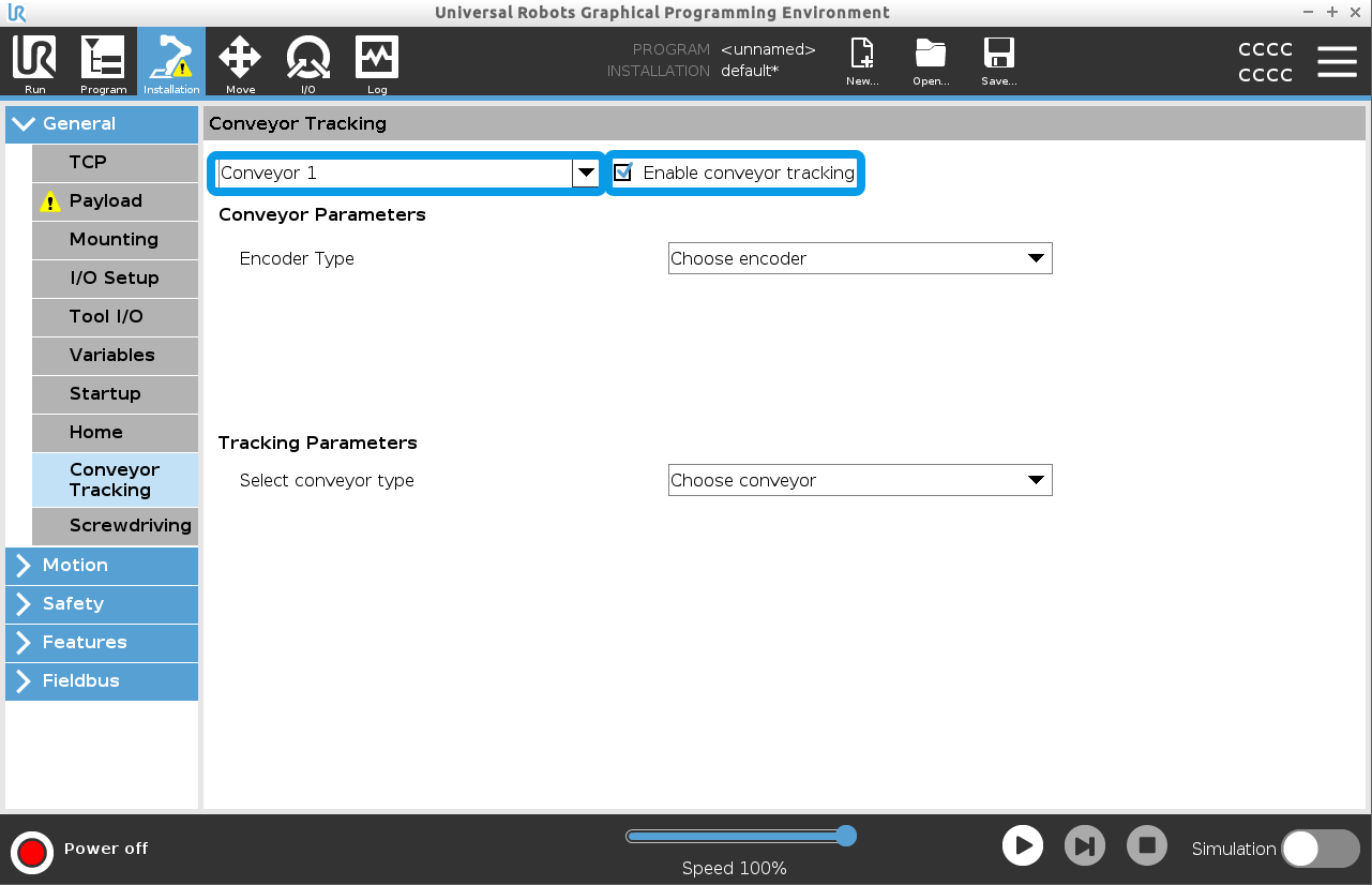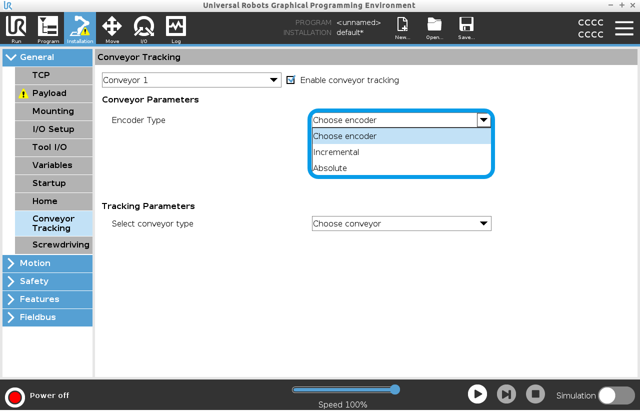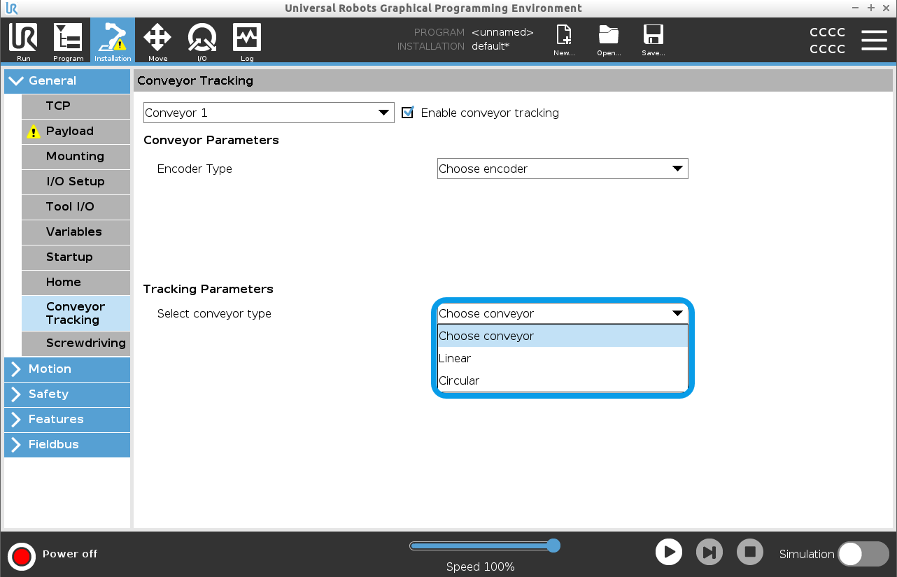 When using a conveyor, the robot can be configured to track its movement. A program node, Conveyor Tracking, is available for tracking a conveyor. When the Conveyor Tracking defined in the installation is configured correctly, a linear or circular conveyor can be tracked. The node can be added from the Wizard Program node under the Structure tab. While the program is executing under the Conveyor Tracking node, the robot will adjust its movements to follow the conveyor. Other movements are allowed while tracking the conveyor but are relative to the motion of the conveyor belt.