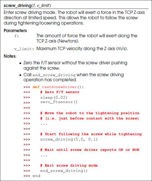 The Screwdriving functionality consists of an advanced command and an installation setup in PolyScope, as well as a URScript function: screw_driving(f, v_limit).