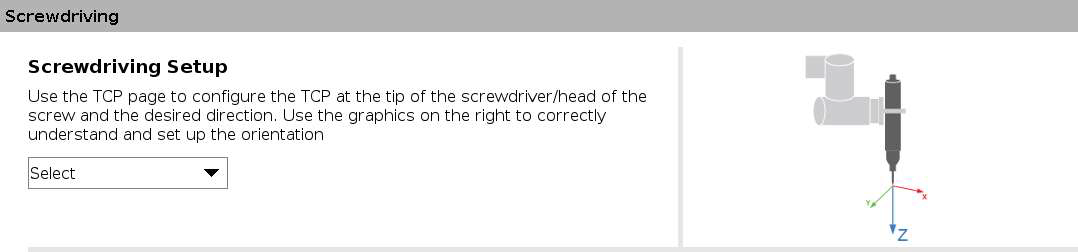 The Tool Center Position should be defined as instructed in the Screwdriving installation setup in order to successfully detect the torque reaction that triggers fast-steady mode through Force and Torque Sensor readings and internal calculations. It should be observed that the positive Z direction of the TCP Orientation must be pointing directly into the hole into which the screw will be tightened.
