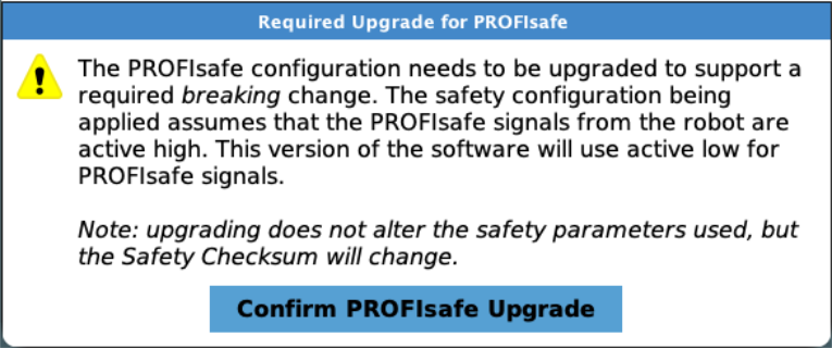 During PolyScope Boot sequence, the user is confronted with a dialog requesting the user to perform a required PROFIsafe upgrade.