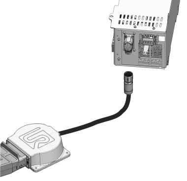 Please see the following for assembling the Base-Mounted Range Extender, 40m, the OEM Control Box, and the robot arm. DO NOT USE the 40 meter cable with UR standard controllers as the use voids certifications. Do not extend the 40 meter cable with other cable options. Unroll the cable before assembling. There is a label on one end of the cable. This end goes to the Range Extender Box, CB side. If you are creating a welding solution, the bottom of the Robot Base part of the Range Extender must be isolated from the welding currents. |