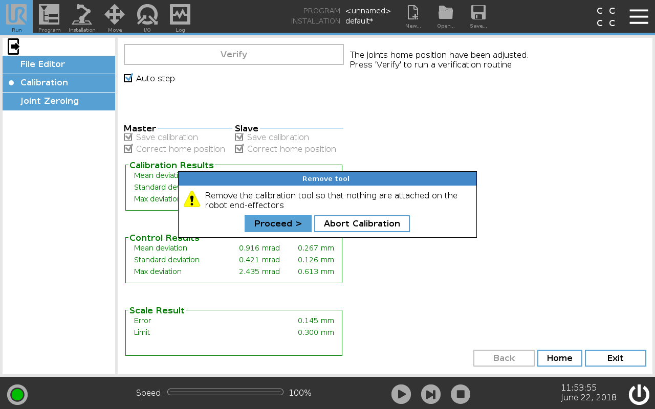 The results of the dual robot calibration are permanently saved after a successful validation. When then the calibration is completed, you have to remove the connector to continue the validation. PolyScope will prompt you to remove the screws from the slave's tool.