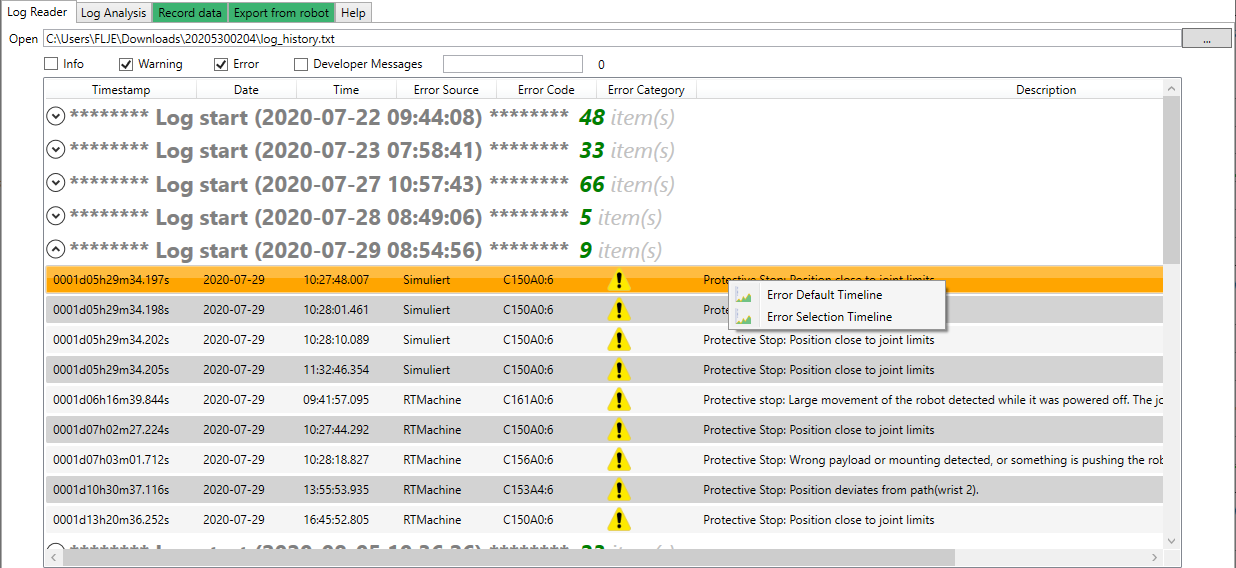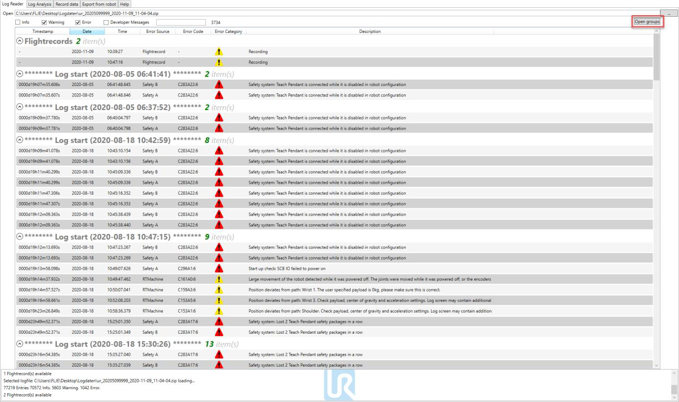 To read the log history section, you must click on the Log Start arrow to open and be able to read where the entries from the robot will be shown accordingly to its date and time and the type of message. The description of the message, error category, error code, error source, time, date and time stamp will be shown after opening the log start entry. You can also press the “Open groups” button to open all grouped entries.