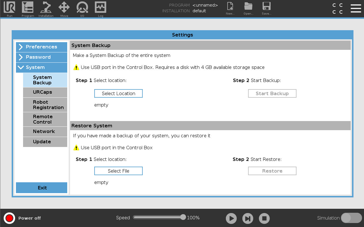 Do not downgrade the robot software to an earlier version prior to the robot's manufacturing date. Do not revert your robot software using older update packages if you have installed 5.8 or above software version. If, for any reason, you need to downgrade below PolyScope version 5.8, you can do so by restoring your old system backup (system backup was implemented from Polyscope version 5.5 ahead).