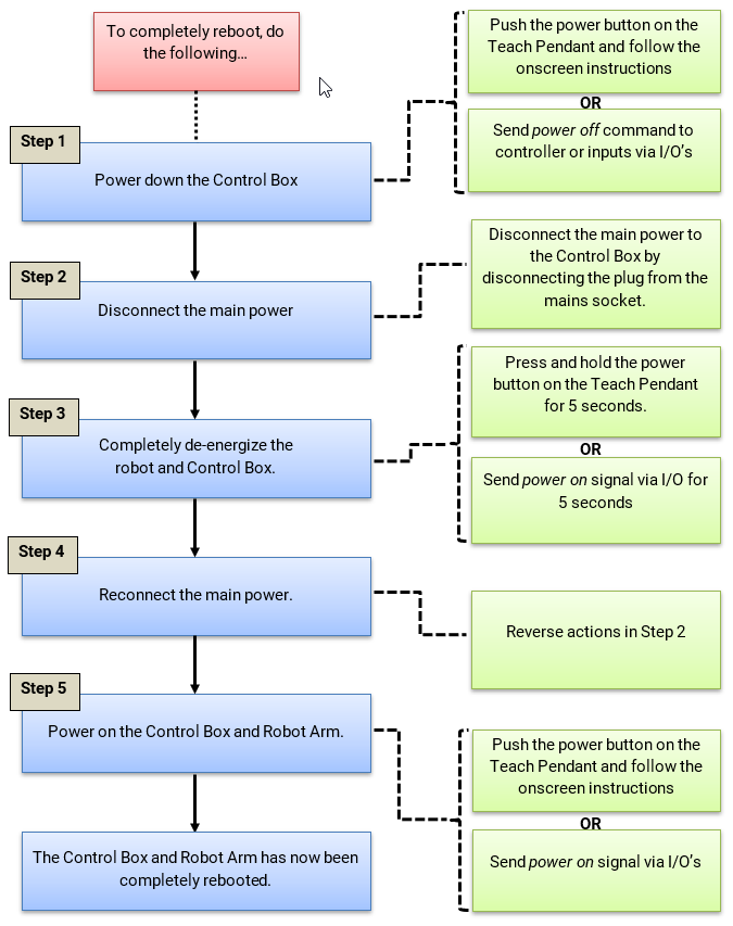 To completely reboot the robot system, follow the following steps: