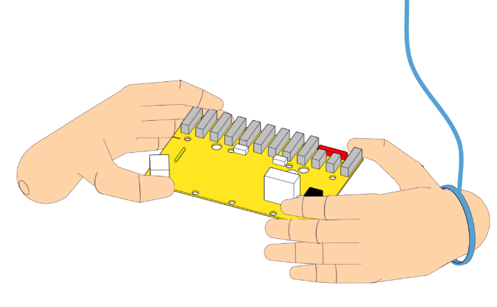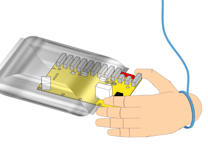 Hold the ESD-sensitive part by its edges. Do not touch its pins or hold directly on any exposed prints.