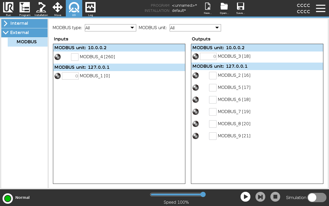 The MODBUS Client I/O signals as they are set up in the installation. Using the drop-down menus at the top of the screen, you can change the displayed content based on signal type and MODBUS unit if more than one is configured. Each signal in the lists contains its connections status, value, name, and signal address. The output signals can be toggled if the connection status and the choice for I/O tab control allows it.