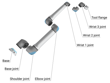 The Joints, Base and Tool Flange are the main components of the robot arm. The controller coordinates joint motion to move the robot arm.