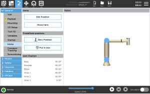 The Home node uses joint angles to move the robot to a predefined Home position. If defined as a Safe Home position,the Home node displays as Home(Safety) in the Program Tree. If the Home position is out of sync with Safety, the node is undefined.